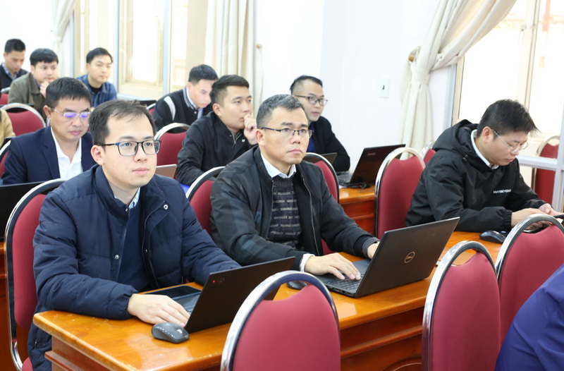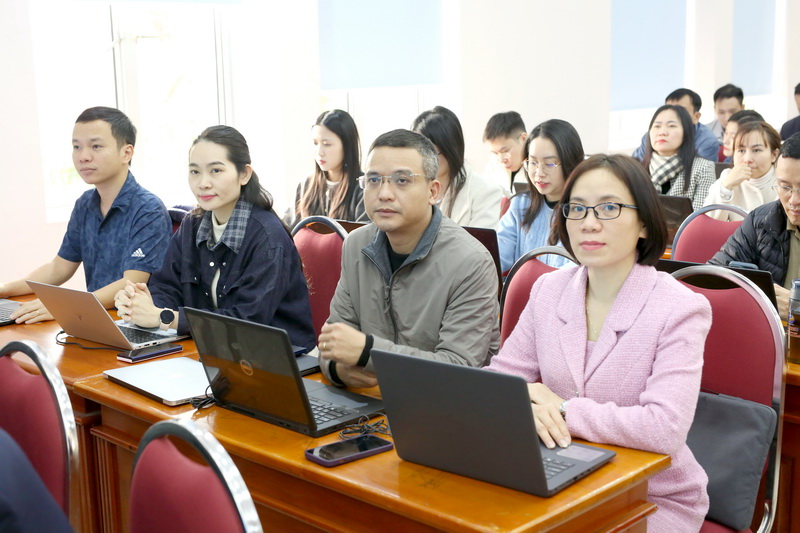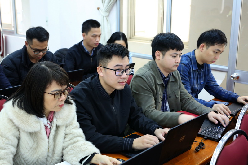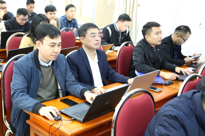 Các học viên theo dõi chuyên gia của Công ty TNHH công nghệ Fastwork Việt Nam giảng qua trực tuyến tại hội trường Văn phòng Công ty